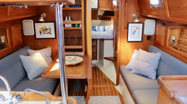 In the 37, the 6-ft. 4-in. L-shaped dinette converts to a 50-in. wide double berth. To port is a similarly sized 24-in. wide settee that, if outfitted with lee cloths, could double as a sea berth.