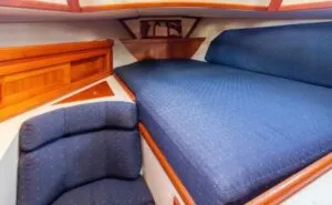 Quarterberths located in the port stern quarter of both boats are located aft of the chart tables. Though the space on the 34 is more than 7-ft. long, it is only 34-in. wide and 20-in. high. Though billed as a double berth, it’s really too tight for two adults. And, because the pillow area doubles as a seat for the navigator, this area may best be used for storage when not being used as a sea berth.