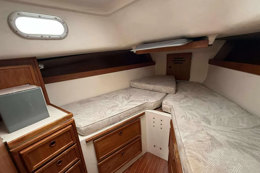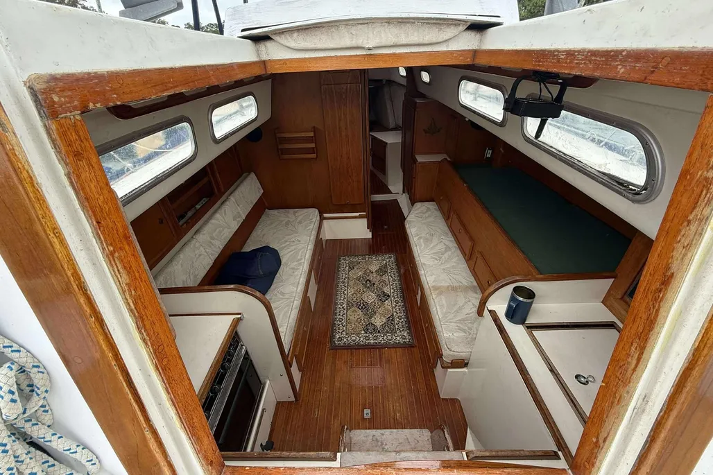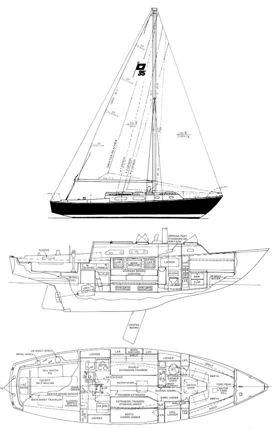 Excessive berths notwithstanding, the 35 has a livable interior. However, note that it does not have a navigation table, the galley tends to interfere with the companionway, and the head is small by modern standards. We do not consider any of these shortcomings serious.