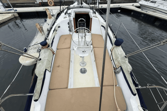 Although the interior is more spacious than the average boat of her era (but less so than 35-footers nowadays), perhaps the strongest appeal of the 35 is her cockpit. By any standard old or new it is big (over 9′ long), comfortable, and efficient, equally suitable for sailing or dockside entertaining, especially with wheel steering and a sloop rig to leave it uncluttered by tiller or mizzenmast. The lack of a quarterberth results in sail lockers port and starboard as well as a usable lazerette.