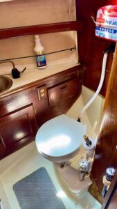 A small head compartment is just aft of the forward cabin, offset to port. A dogleg in the bulkhead between the head and cabin renders the toilet a fairly tight fit. There is some storage space under the head sink, with a shelf above. Headroom is 6 ft.