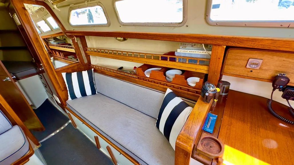 Main cabin storage is somewhat limited, with shelves outboard of the settee and dinette, bulk storage beneath.