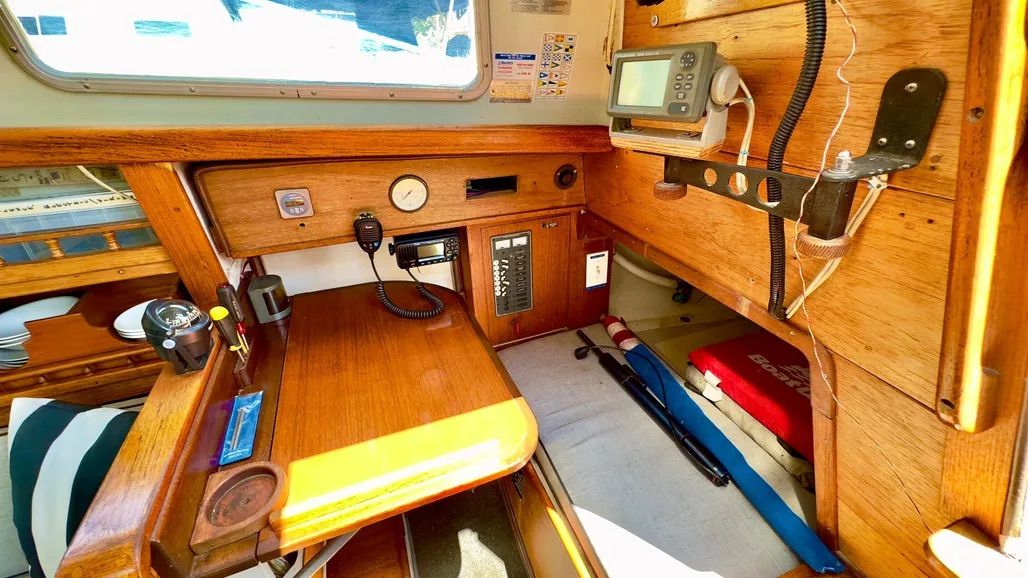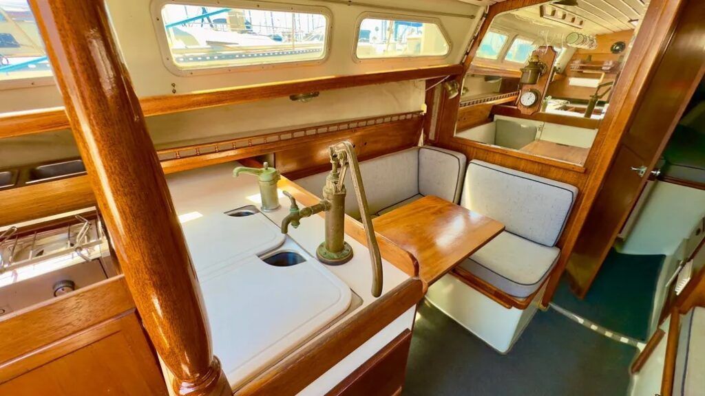The galley and nav station are at the aft end of the main cabin. The port-side galley has room for a two or three-burner stove with oven. Unless an owner has retrofitted with propane, it will be an alcohol stove. In our opinion, pressurized alcohol stoves should be consigned to the nearest dumpster at the first opportunity.