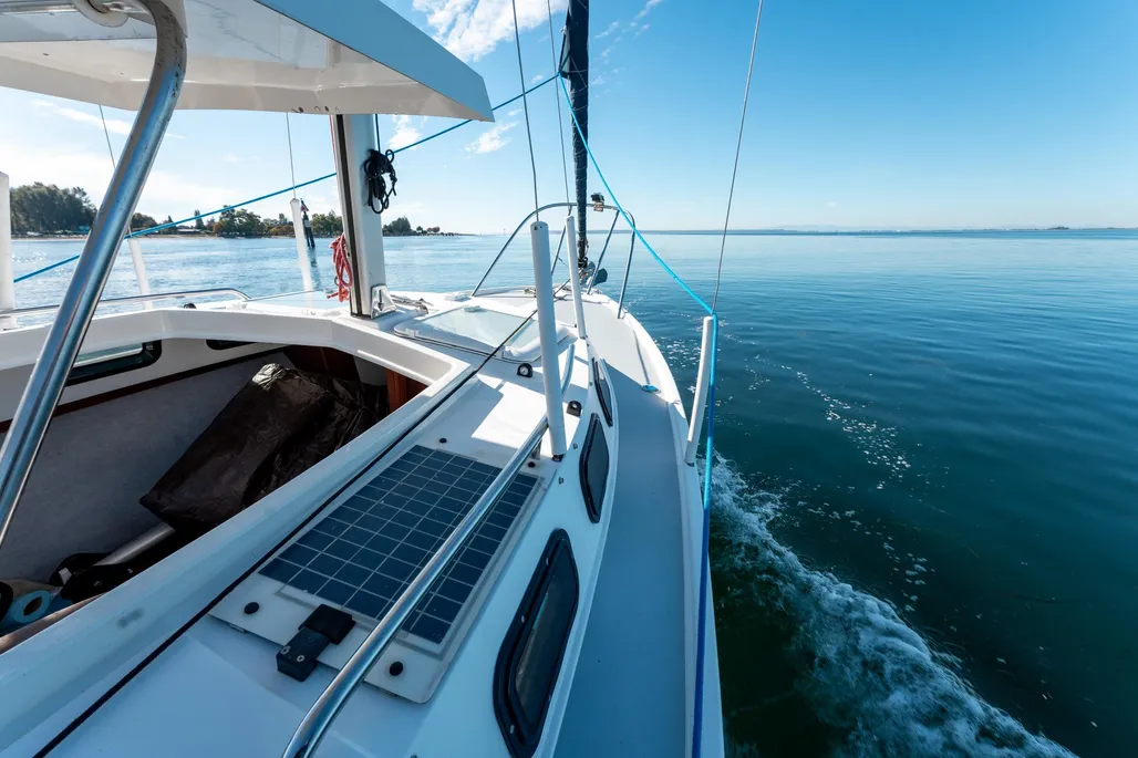 The coamings, which function as backrests, have a pair of compartments, each with two shelves. The flared gunwales are comfortable for hiking out. And there’s a socket in the sole so that a table can be moved from belowdecks to the cockpit. The stern rail is mounted on the side decks, outboard of the coaming, to make sitting on the coaming tops more comfortable. Optional are a pair of swivel seats—complete with backrest and padded armrest on the rail—that mount on the coaming.