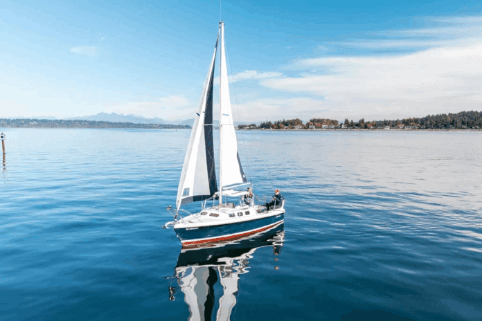We took the Rhodes 22 out on a breezy day—18-20 knots, with a 1′-3′ chop. Getting underway was as easy as advertised; we started out with the full 175% genoa and full main.