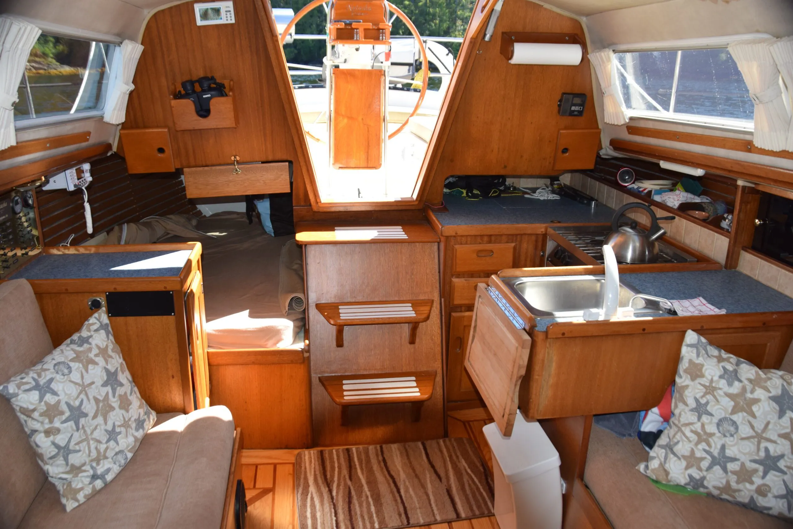 The main cabin is comprised of two opposing settees. The starboard settee is 6-ft. 6-in. long with properly tilted seat backs for a comfortable seating position. There is excellent storage underneath and behind the seat backs. There is also open storage on a shelf above and behind the back rest. In later models this storage was tucked behind teak cabinetry. The port side settee appears shorter due to the galley intruding on its length. However, the settee extends under the galley counter and is actually the same length. It also has storage behind the seat back and open storage on a shelf above. Aboard Natasha the open storage has been hidden behind tinted plexiglass slides set in mahogany trim, a very tidy appearance.