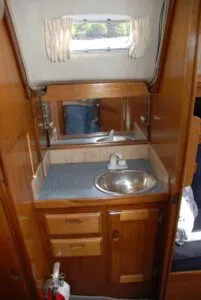 The head compartment straddles the boat, toilet with a large open locker to port and small vanity to starboard. Later models incorporated a shower sump and track for a shower curtain. No such accommodations in the early models. The opening hatch is directly overhead for ventilation. Light is provided by two fixed ports (early models) or two opening ports (later models). With the head not confined to a small, fixed compartment as in similar sized boats of that era, there is plenty of room to prevent claustrophobia. Aboard Natasha the entire head becomes a shower compartment with appropriately sized curtain and sump. This is very convenient when a shower on deck is not appropriate.