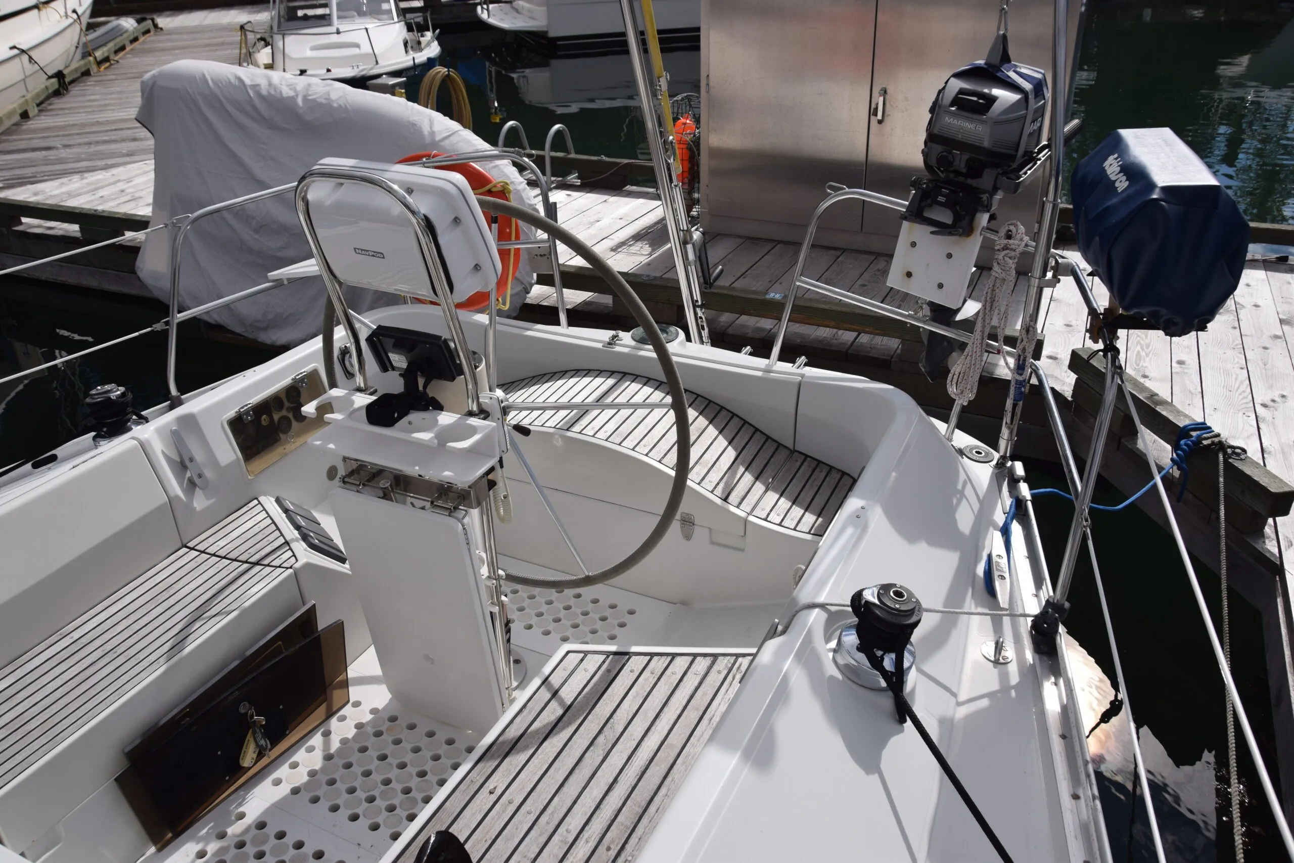 The cockpit sole is curved up towards the gunnel at the T, allowing excellent footing for the helm position at the leeward side when sailing. From a personal view, these curved soles invite twisted ankles until familiar with the curve. I much prefer a flat surface, particularly when motoring or stationary. The factory teak cockpit grate forward of the binnacle has long since been replaced with a HDPE (StarBoard) grate.
