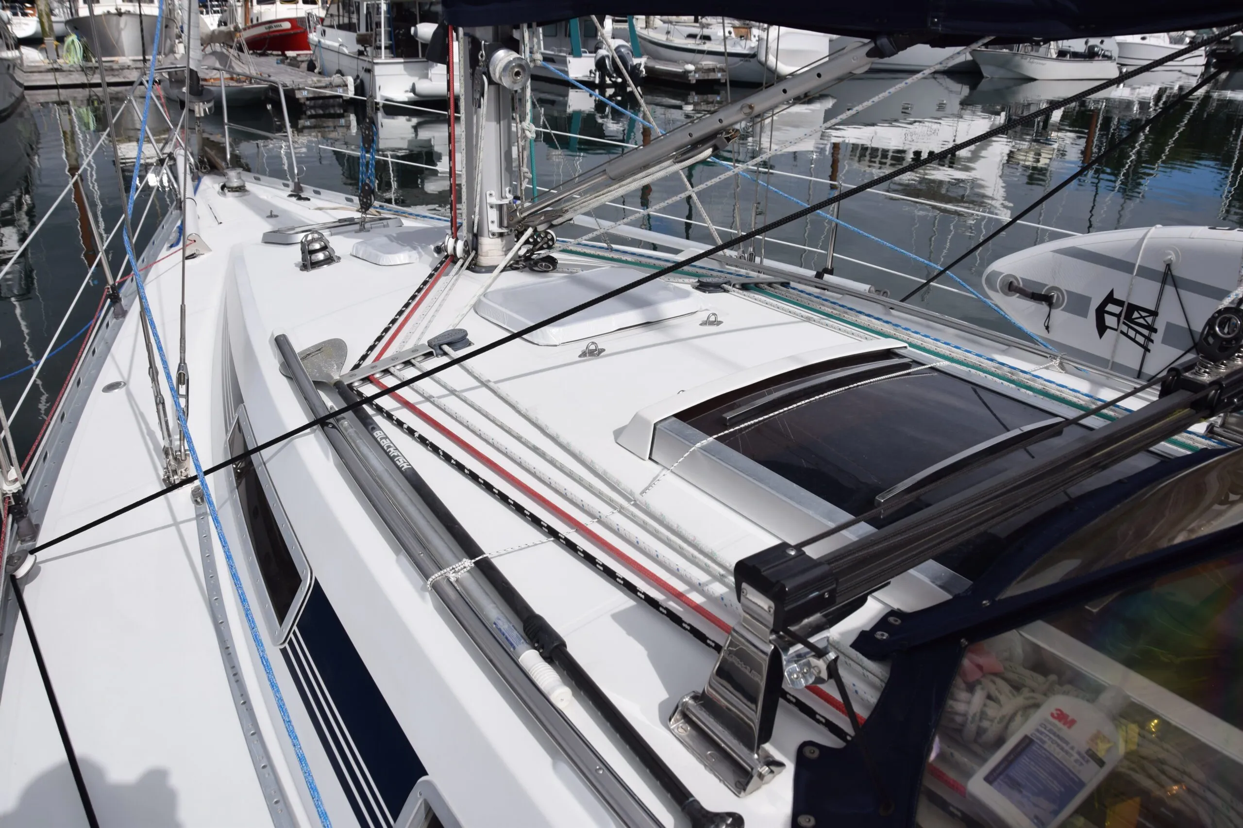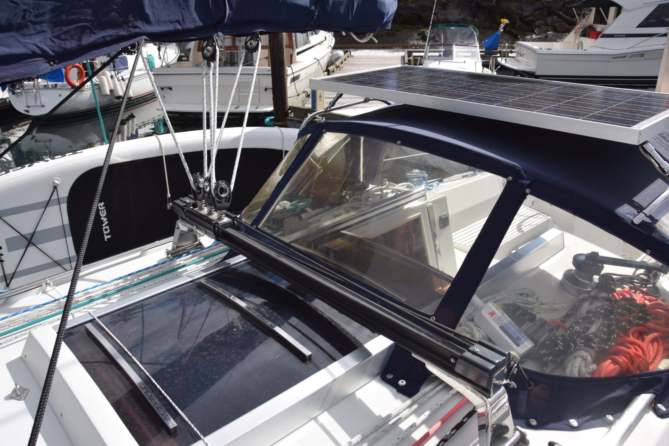 Halyards and control lines exit the mast to turning blocks at deck level, then out to deck organizers and back to line stoppers with self-tailing winches at the trailing edge of the coach roof. The mainsheet, on a recessed traveller on the companionway bridge deck, was always in the way and not within reach of the helmsperson when short handed. It was eventually replaced with a Garhauer traveller mounted just forward of the companion way slide/hood with control lines led back to the cockpit. Still not within reach of the helm, but at least out of the way when not in use.
