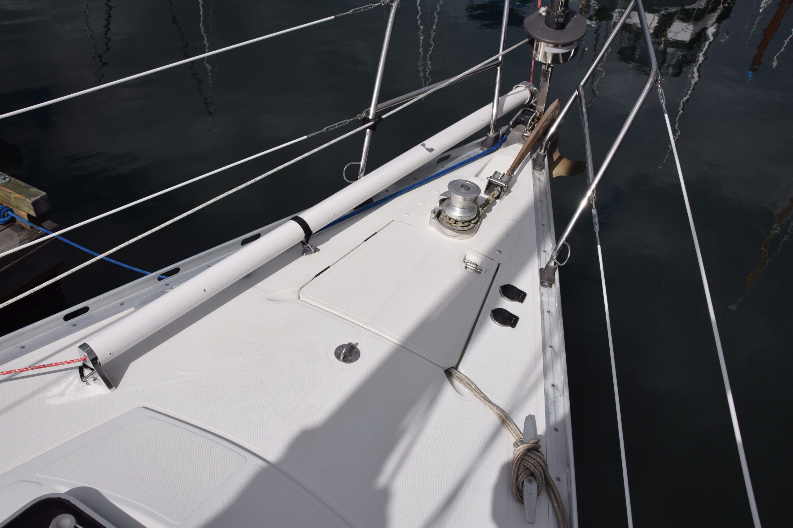 The Harken furler on the forestay is set-up with an extended tang to allow extra room for the anchor on the double roller, cast aluminum anchor platform. Depending on year of manufacture, a stainless-steel double roller platform was also installed. A vertical windlass was added during the Mexican cruise, mounted just forward of a deep anchor locker, which provides plenty of room for chain and rode. Recently installed was a short extending bow sprit for the asymmetrical spinnaker. Unfortunately, this arrangement blocks the port side roller, not really a problem for a coastal cruiser where a single anchor is most common.