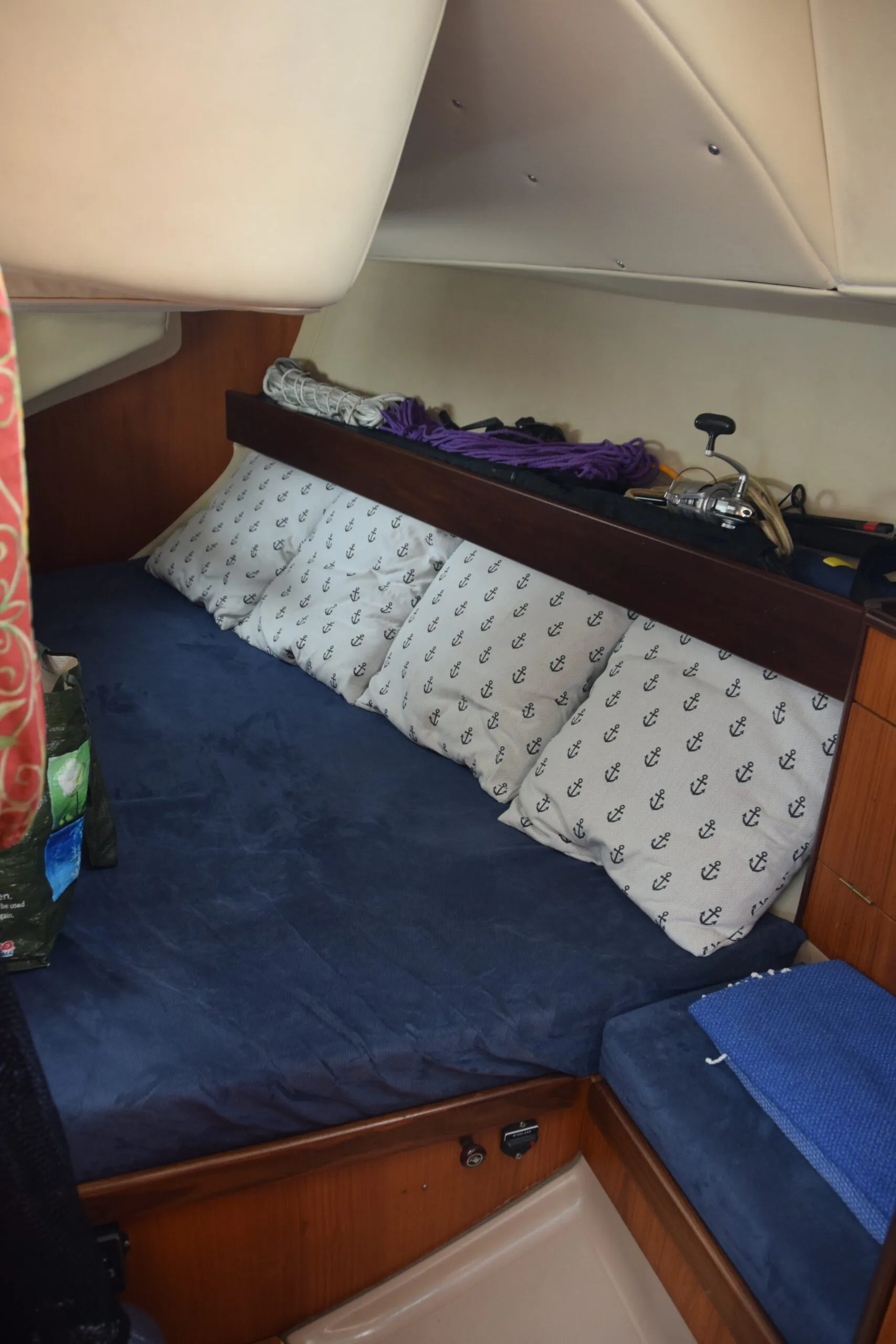 The door to the aft double cabin is adjacent to the galley and can be accessed without disturbing the galley slave. The aft cabin is a generous double with the usual low overhead under the cockpit sole. Storage is provided with an exposed shelf against the hull and a small hanging locker. As in many boats of this era, the cabin liners had failed over the years with the vinyl separating from the open cell foam glued to the hull and overhead. Aboard Shadow Rose this has been replaced with vinyl and closed cell foam panels screwed into place, maintaining the original appearance. An opening port into the cockpit provides ventilation.