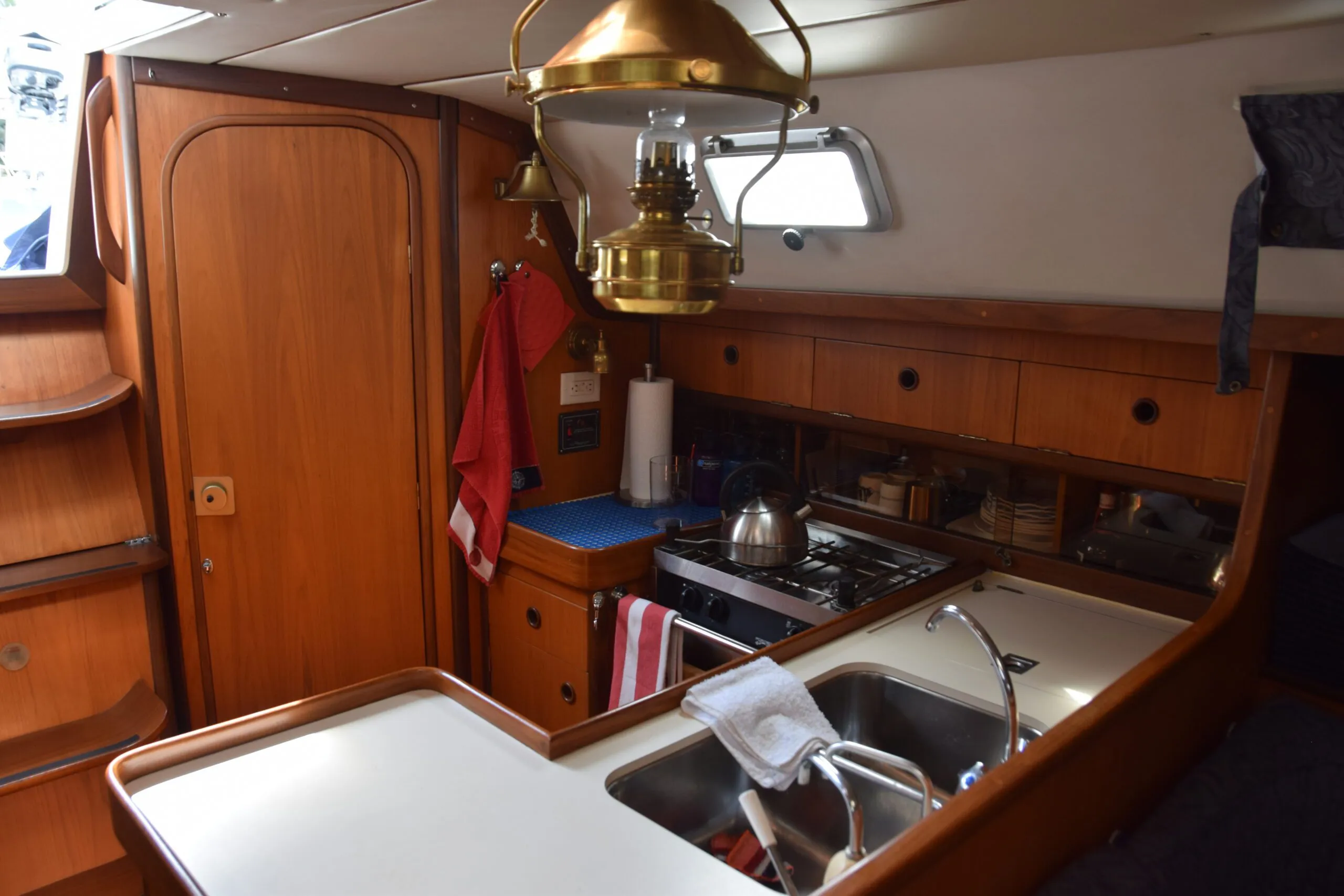 At the bottom of the three steps into the cabin the U-shaped galley is to port with a substantial island and countertop on the centerline. The deep double sink is just off centre with the icebox (refrigeration added) immediately outboard, the gimbaled two-burner propane Force 10 stove/oven is against the port hull. Storage above the stove and in the surrounding cabinetry is exceptional. An opening port provides ventilation should the main hatch be closed in cool weather.