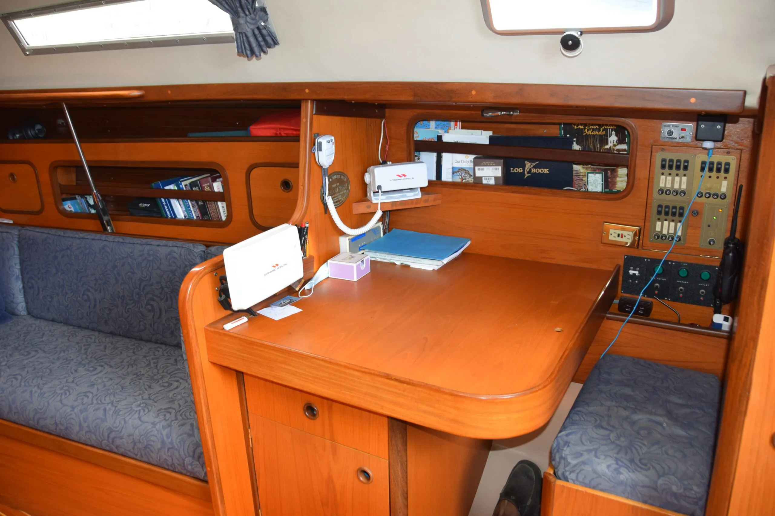Forward of the head is the dedicated nav station with seat and chart table. Storage under the seat, in the chart table, and in cubbies against the hull provide plenty of room for every sailor’s “stuff”. Shadow Rose has the original electrical panel with a number of switches now double purposed for additional electronics. An upgraded panel would be an appropriate addition here. There isn’t an abundance of room for electronics, but then the most important electronic navigational aids are at the cockpit helm, where they belong.
