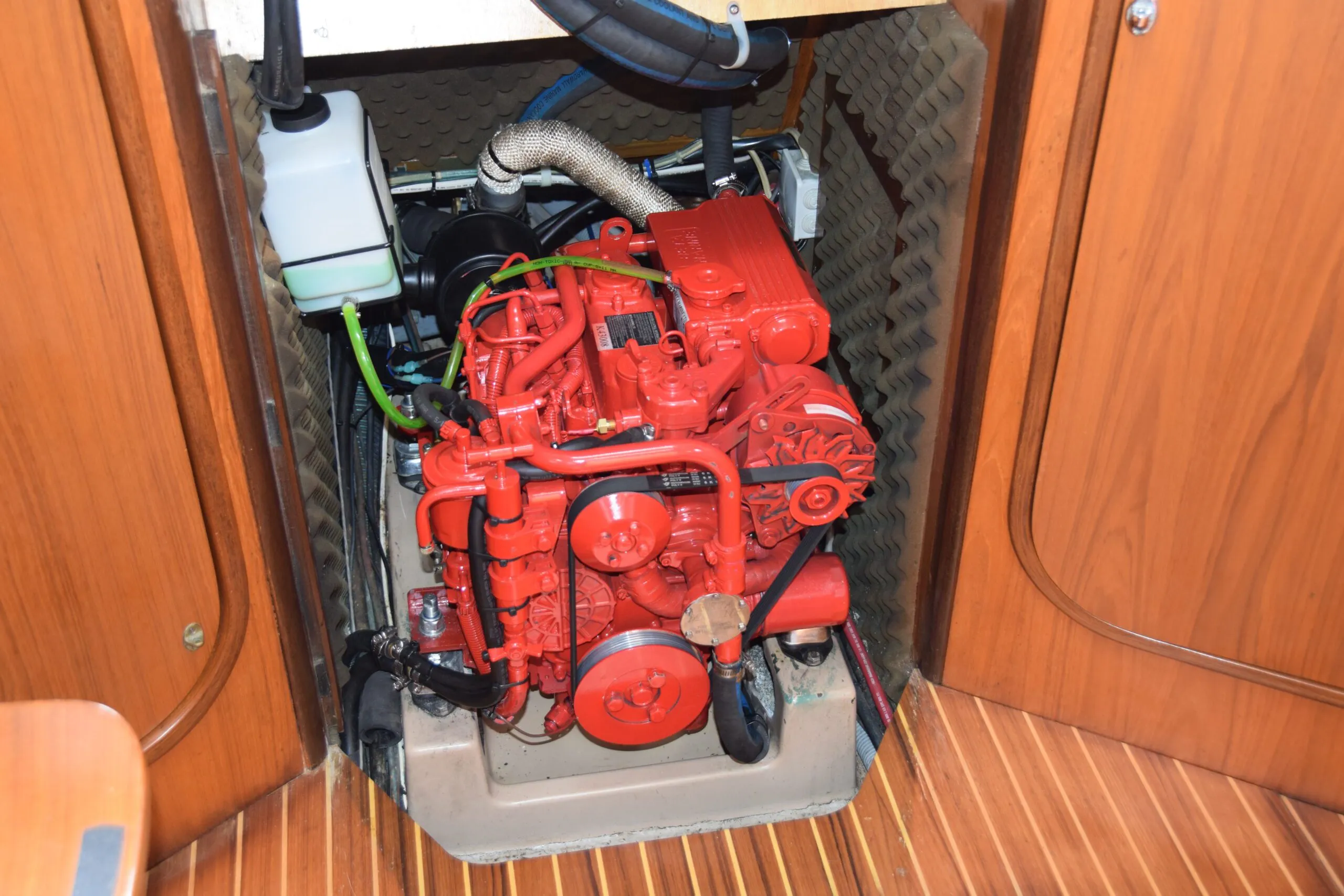 Servicing access to the engine compartment is excellent with the removable companionway stairs and an opening cabinet in the aft cabin.