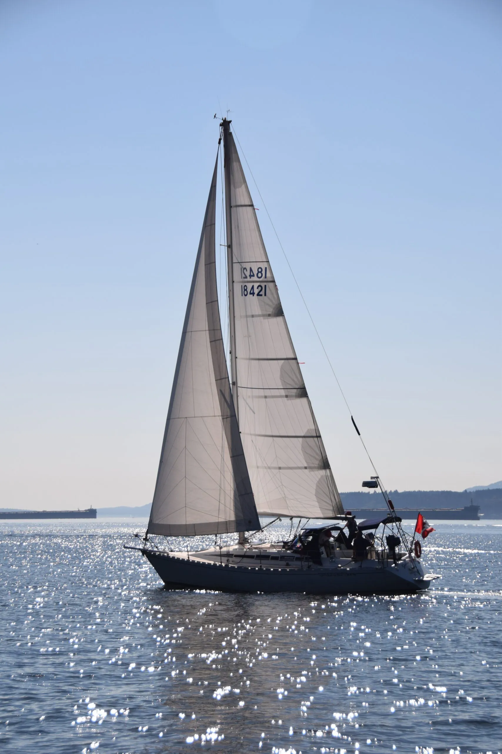Recent purchases include a new fully battened main with lazy jacks and 130% genoa from a local loft. A 90% jib is also available but seldom used in the coastal environment. It’s stored at home. For sailing through a British Columbia summer this is quite adequate. An asymmetrical spinnaker flown off the new retractable sprit at the bow enhances off-wind performance and completes the sail inventory.