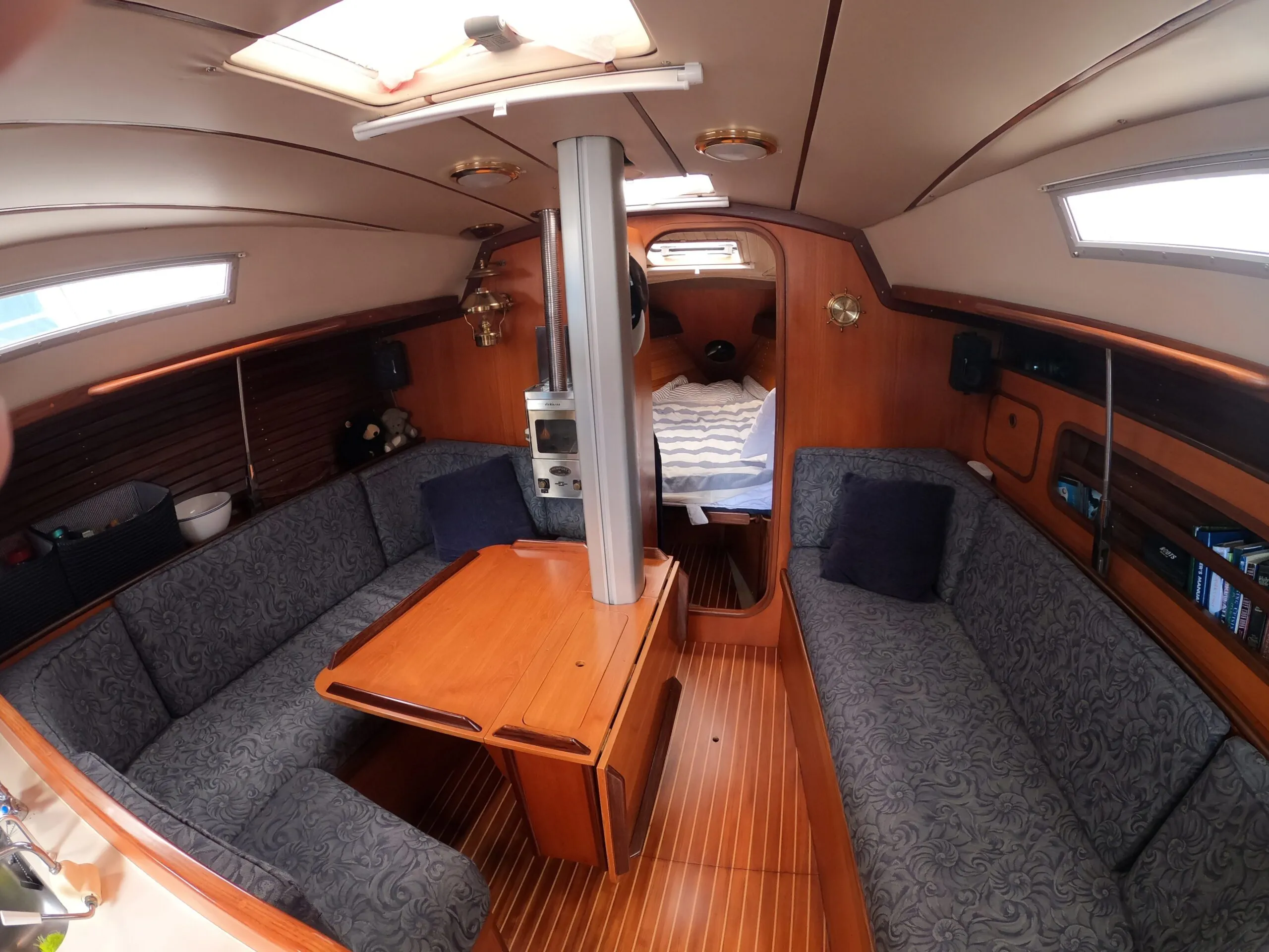 Climbing over the the cabin is like a flashback in time. The warm teak cabinetry is evident throughout the interior, the epitome of upscale production boat cabins of the 70 & 80s. The main cabin cushions aboard Shadow Rose have been replaced and the new dark blue fabric complements the rich teak nicely.