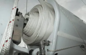 Prior to reefing, make sure that the boom-to-mast angle meets manufacturer’s recommendations, usually around 87 degrees. Also, overtrim the headsail so it will deliver less drive and more roll dampening effect. During the reef, continue ensure that the halyard release rate keeps pace with the rate of the mandrel rotation. Note how the sail luff is layering, and if necessary, slightly change the boom angle to keep the luff from crowding the gooseneck or moving too far aft. This approach to reefing lessens the apparent wind and dampens the vessel’s pitch and roll. It also moves the boom and main sheet tackle away from the center of the cockpit.