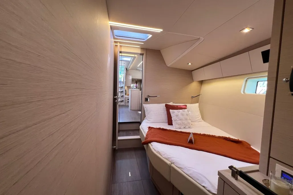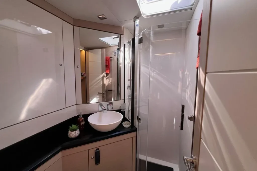 Astern of the galley, the master stateroom covers the whole width of the hull. Palatial in size with a standard flat screen television, desk, seating area and large private ensuite—a much better master stateroom than any catamaran I’ve ever seen. The stateroom is gorgeous with huge amounts of hanging storage space and numerous drawers. Because it’s a monohull, you should be able to sleep more soundly without the waves crashing into the bottom of the bridge deck. Do any catamaran sailors disagree?