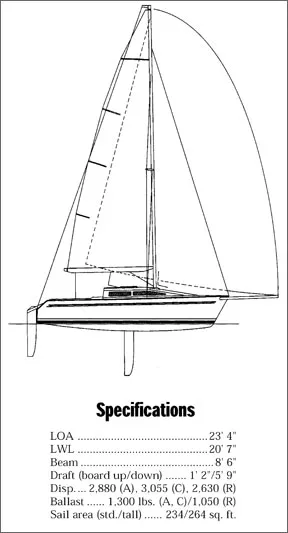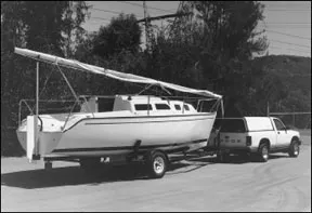 Dry weight of the boat and trailer is 2,080 pounds without gear. As we have noted on the MacGregor 26 and Catalina 250, the water doesn’t drain until the hull is out of the water, so even though a suitable mid- or full-size car might tow the empty boat, the car will work hard to get the boat up the ramp.