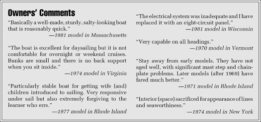 Under the more modern PHRF rating system, which is a performance-based handicap system rather than a measurement rule, the Sprite has an average rating of about 270 seconds per mile—hardly a rule-beater, but reasonably fast for a full-keeled 23-footer. (One owner crowed about beating those “tubby” Cape Dorys—in all likelihood a competing Alberg design.)