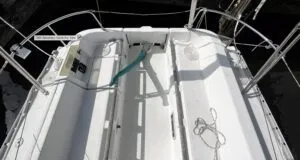 Both boats have swim platforms and stainless swing-down swim ladders. The Catalina easily wins the Ladder Sweepstakes with a four-step, 24-inch wide ladder with flat plastic treads, compared to the Beneteau’s three-step, 8-1/2-inch wide ladder with treads only 1-1/4-inch wide, made by flattening the stainless tubing a bit.