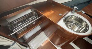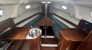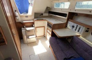 The Beneteau has the edge on locker space, with three separate hanging lockers (including one open-air unit in the head), and a liquor cabinet under what a Beneteau brochure describes as a nav station. Still, this small horizontal surface gives the galley slave some countertop space. The Catalina also suffers from lack of sufficient galley top working space…one of the compromises you’ll find in boats of this size range.