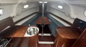 The Beneteau’s genoa sheets lead to cars riding on C-shaped aluminum tracks, which double as handrails, on the cabintop. It’s not easy to grab the tracks/rails, which require feeding your fingers through a narrow slot molded into the coach roof. We’d rather see separate handrails. We’d also prefer to see the Beneteau’s cockpit mounted mainsheet traveler track moved forward onto the cabintop (as the Catalina is configured), so crew moving from cockpit to cabin don’t have to dodge the mainsheet and car. But, unfortunately, moving the track forward isn’t feasible because of the long companionway bridge deck, which reaches forward beyond the boom’s midpoint.