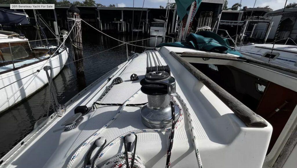 The Beneteau features a seven-eighths rig with single spreaders, adjustable split backstay, mast stepped on deck with compression strut in the cabin, and shrouds tied into a force grid molded into the cabin top via a set of studs threaded into a patented configuration involving stem balls set into bronze plates. (We’d prefer a set of conventional-and more easily adjustable and replaceable turnbuckles.) The mast is stepped on a hinge for lowering the spar at bridges, trailer ramps, or for maintenance, but Beneteau says use of the hinge is not recommended without side-sway preventers- currently available as an option in Europe, but not in the U.S.