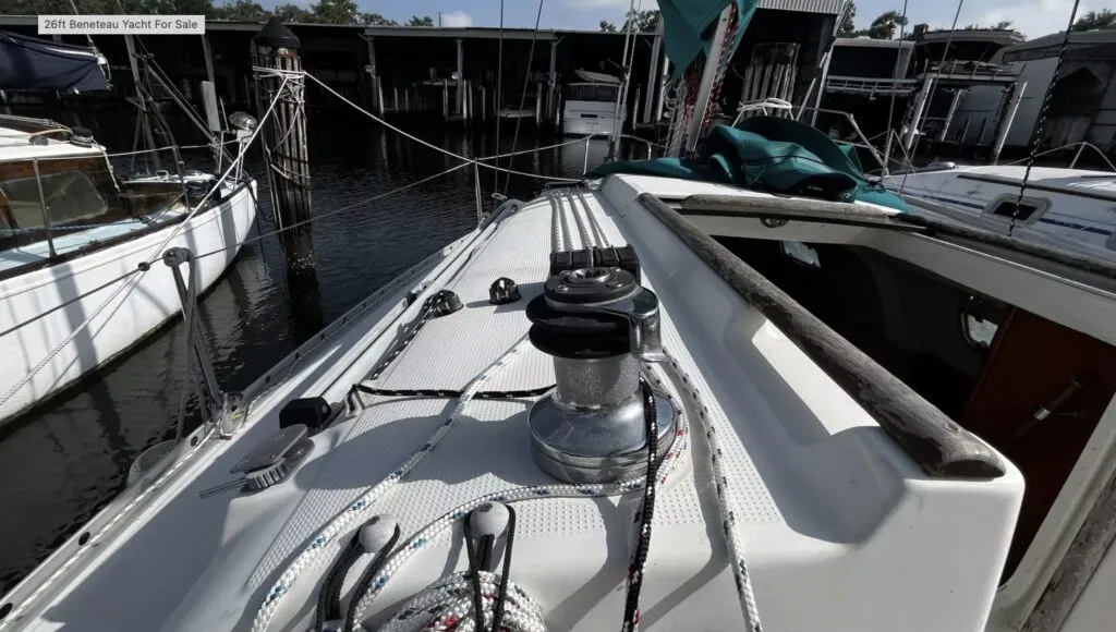 Both the Beneteau and the Catalina utilize modern wide-body, fin-keel, spade-rudder configurations, relatively long waterlines, and moderate rigs with shrouds moved inboard to permit a narrower sheeting base. The Beneteau has a slightly shorter LOA but longer LWL (length waterline), and a nearly plumb bow. The 265’s draft is mid-range (4′ 2″ vs. the Catalina’s choice of 5′ 0″ deep fin or 3′ 6″ fin with wings).
