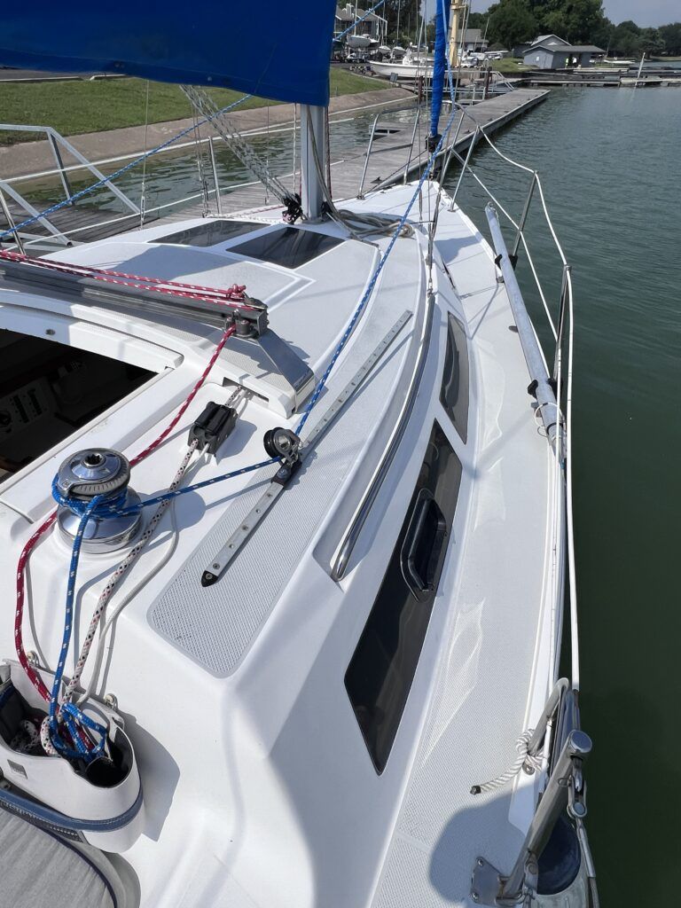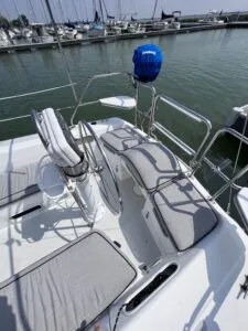 The Catalina’s masthead rig, even with double spreaders (permitting use of a lighter spar than the Beneteau), is more conventional. Although the Catalina’s mast is shorter and its mainsail is smaller, the foretriangle height is two feet taller than the Beneteau’s, resulting in more total sail area when setting a big genoa.