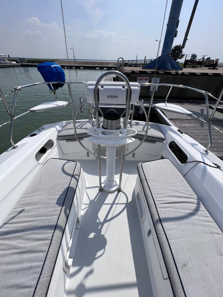 In contrast, the Beneteau seats no more than seven at the dock, and that assumes that one passenger is seated atop the traveler and the tiller is swung up out of the way.