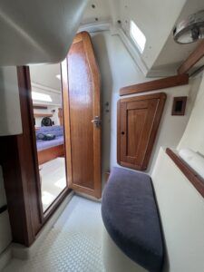 All berths on both boats have comfortable 4-inch cushions. The aft berth on the Beneteau measures 60″ x 77″, and you sleep parallel to the keel; the Catalina is slightly narrower at 57 inches wide, is 74 inches to 86 inches long depending on which side you’re on, and you sleep athwartships. We wouldn’t be inclined to sleep two in either aft berth, since the inside party not only doesn’t have much vertical roll-over room due to incursion of the cockpit sole, but also must crawl over the outside party to get up.