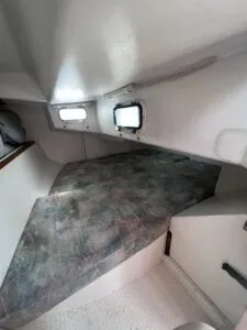 The forward berth on the Beneteau measures 19 inches at the front, 76 inches at the back, and is 88 inches long. On the Catalina it’s 10 inches at the front, 68 inches at the back, and 75 inches long. Tall folks will appreciate the larger Beneteau berth.