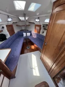 The interior layouts on the two boats are quite similar: a large double-berth aft, galley to port next to the companionway, head opposite the galley, U-shaped dining area around a smallish table supported by the mast compression post with a V-berth forward. (See line drawings.)