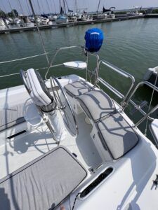 The Catalina’s ladder swings up to form the center part of the push pit, a clever and neat-looking design. The Beneteau ropes off the transom area with a length of lifeline and a pelican hook.