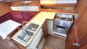 The starboard-side aft cabin—entered through the galley—will likely be used as a guest cabin or storage space, especially in warmer climates where limited ventilation makes it less desirable than the V-berth for sleeping. It has a sizable athwartship berth, and there’s a seating area between the berth and the galley. Cooks are never happy with a door that opens into their galley, but this is a necessary compromise for having an aft head, a valuable asset on a sea boat, where it can double as a wet locker for foul weather gear. The other galley complaint we’ve heard was the limited storage for LPG gas in earlier models, although members of the very active owners’ association offer various ways to solve this.