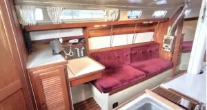 The interior design is in the European mode, the first of the Catalinas to have the head aft by the companionway. Unlike European boats of this era, such as the Beneteau or Jeanneau of the same size, however, the Catalina is very full forward, with a big V-berth cabin and a big dinette and settee ahead of the L-shaped galley and nav station. (Some early models had the water tank forward, which is less desirable.)