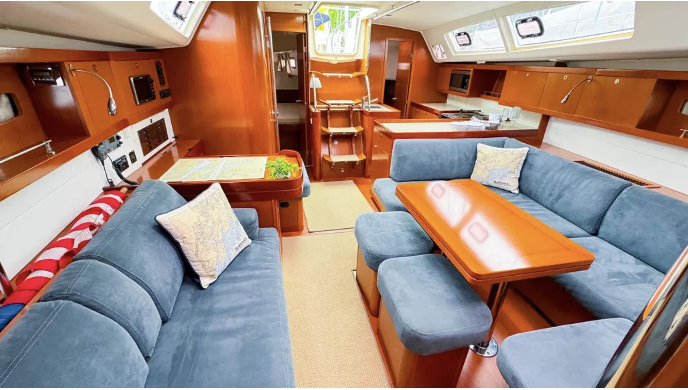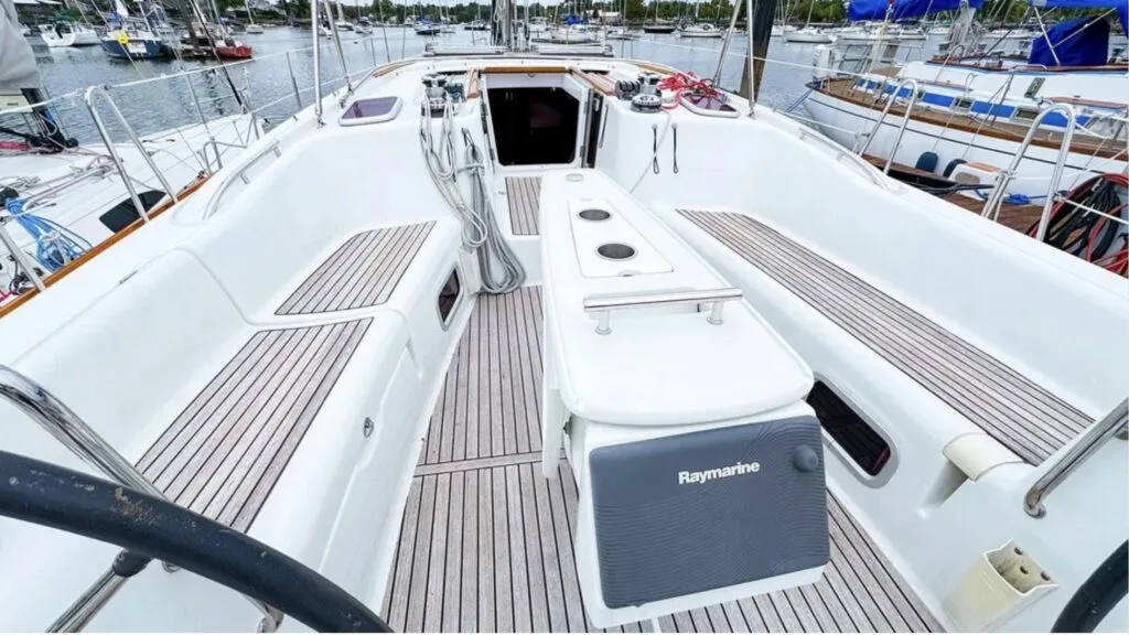 The 46 (like its near-sisters) looks too racy to be a cruising boat. Its house is long, low, and streamlined. The coachroof starts in mid-foredeck, rises minimally to encompass the big windows, and descends again to blend with the coamings. On one hand, the impression is all flow and unity—not “flush-decked,” but visually integrated. On the other hand, accents like the wooden toerails and eyebrowed handholds pick out its slightly curved sheer and lower its visual height. The 46’s slit-like hull ports make its hull look longer and lower. Its oversized windows help flatten the profile. Stem and stern angles strike a distinctive balance, crisp yet traditional. While we wouldn’t go quite as far as Wayne Burdick, president of Beneteau USA at that time, who pronounced the boat “floating art,” we have to agree that it is unique and attractive.