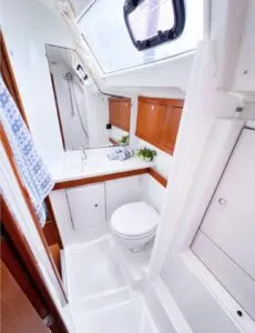 Sailhandling systems have evolved to make modern boats significantly easier to sail. One good example is in-mast mainsail furling which Beneteau offers at no extra charge on the 46 (and its other Beneteaus). Vertical battens (which promote improved shape and close-to-maximum area) plus better-engineered mechanisms have prompted eight out of every 10 buyers to choose this convenience. Also, smaller foretriangles (a J reduced from the 473’s 18 feet, 3 inches to 16 feet, 6 inches), plus jibs reduced from 150 percent overlap to 135 make for headsails that are much easier to tack and trim. We applaud the pre-engineered anchor in the foredeck made to accept a detachable forestay. Thus, a boat like this can hoist a hanked-on storm jib in heavy winds and waves and vastly improve its sea-worthiness.