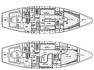 Plan B is the same except for a rather unusual L-shaped dinette and a double berth forward offset to starboard. One leg of the dinette deadends at a bulkhead, making it appear that persons sitting there are more or less trapped by the table, which also runs to the bulkhead.