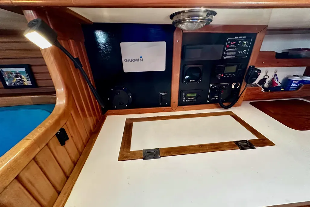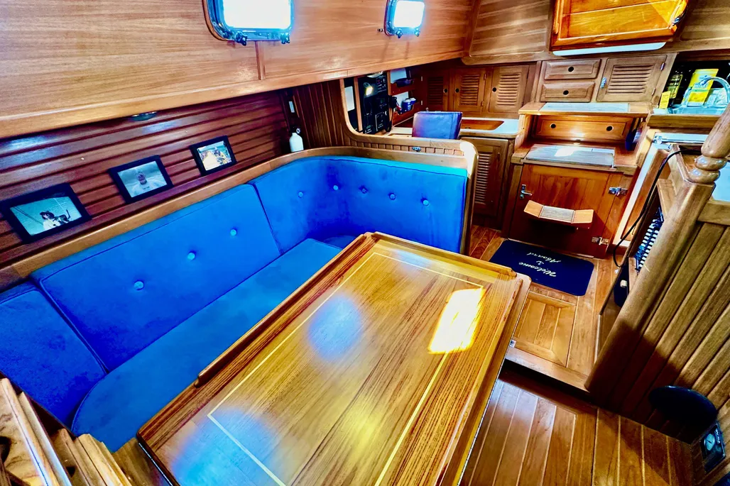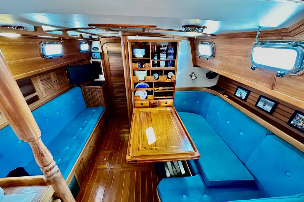 The rig is a cutter, which means the mast is located somewhat farther aft than on a sloop. It’s keel-stepped, so the designer had to plan where it would be in relation to the interior. On early models, the 38’s mast passes through the dinette table, which is perhaps unavoidable, but it does obstruct your view of your tablemates.