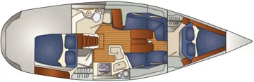 The boats deck layout, spars, and hardware are all designed for racing efficiency. An oversized cockpit not only provides room for all of the posteriors and elbows involved in takedowns and spinnaker jibes. It also gives the main trimmer a well-chosen spot forward of the helm where he can work with efficient Harken “gross/fine” sheet controls tools. The helmsman enjoys excellent visibility plus a wrap-around seat and 60-inch wheel. Rail riders should appreciate a radiused rail that takes some of the pain out of hiking. (A full-length toe-rail is optional.) Two hatches, the forward-most sized right to accept a doused spinnaker, break up the foredeck.