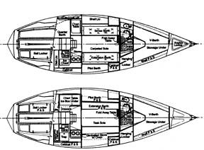 The interior plan is straightforward and functional. Two layouts were offered during the production run. Hulls #1-90 have twin pilot berths in the saloon. Hulls after #90 have an extension berth and pilot berth to starboard and a settee/berth to port. This later plan also has a quarterberth to port, whereas the earlier plan has no quarterberth, but instead an ice box with chart table over. In both layouts there is a V-berth forward plus enclosed head and hanging locker. Maximum headroom is 6′ 1″.