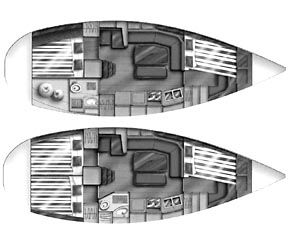 Displacement of 13,000 pounds and ballast of 3,528 pounds produces a 27% ballast ratio; however, with much of the lead deep down in a bulb, plus her generous beam, she produces a fairly stiff ride. The draft of the standard keel is 5’10”. A shoal draft version is an option.