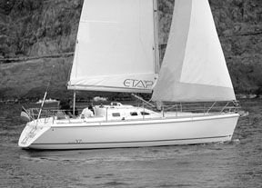Headsail track is located inboard at the base of the cabin, with sheets led to Lewmar 44 self-tailing winches that were large enough for easily handling the 135-percent genoa, which carries 427 square feet of Dacron.