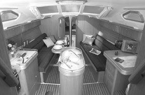 Though the configuration of spaces belowdecks is typical of the genre, we found several attributes that stand out when compared to competitive models. For instance, the on-watch crew can sit atop the companionway step and have an fairly clear, 360-degree view through ports on both sides of the cabin, and the large Plexiglas ports on the front of the cabin. The solid cherry and cherry veneer wood surfaces below enhance the feeling of spaciousness, and handrails port and starboard in the saloon are an absolute necessity for an offshore passagemaker.