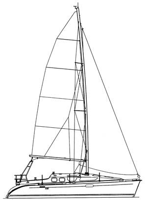 A stateroom is situated aft below the cockpit. The galley and head are on opposite sides at the foot of the companionway, the main cabin is slightly forward of amidships, and the master stateroom is forward.