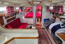 The saloon has two 6′ 4″ settee/berths covered with 4″ closed-cell foam cushions. The dining table folds upright on the bulkhead when not in use, and the fastener holding it is flimsy.