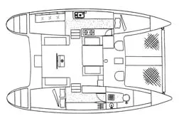 The permanent sleeping berths, galley and nav station are situated in the port and starboard amas.