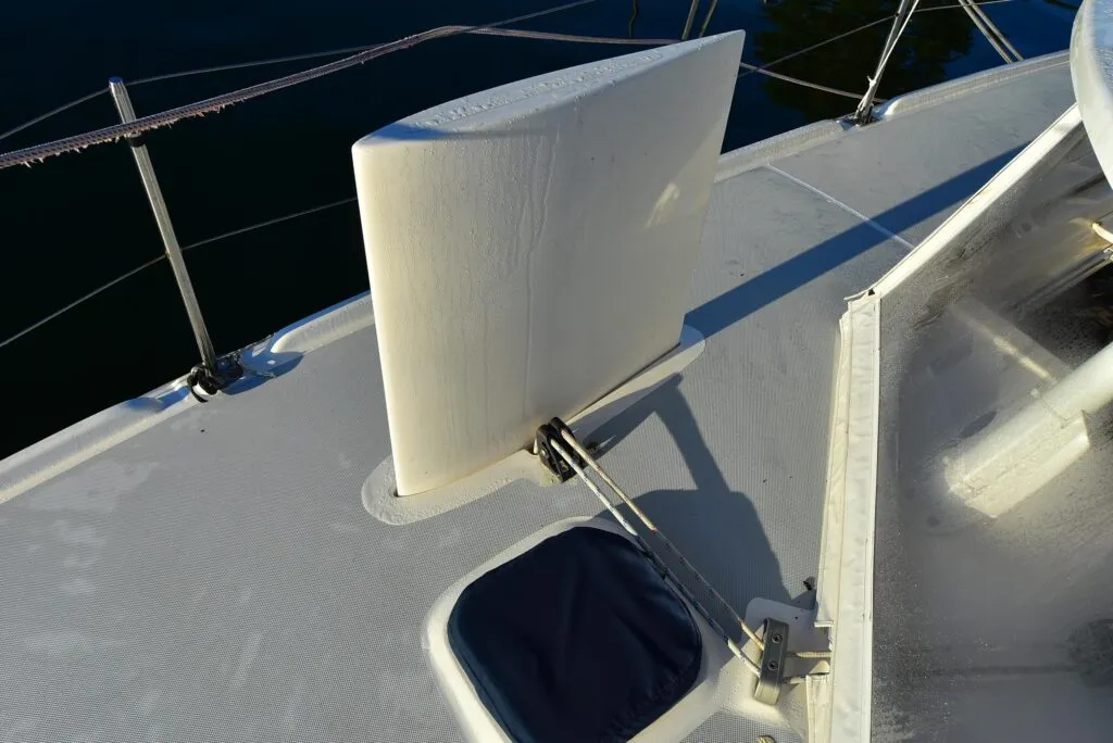 A solid walkway extends to the bow between the forward trampolines. (“They’re plenty robust,” the same skipper reports, “but they’re springy enough that I don’t like to walk on them.”) Ground tackle is top shelf: a 50-pound Delta Quickset anchor plus a Fortress FX-37. Rollers are stainless and well-sited. There are good-sized chocks and cleats. Two large, self-draining lockers in the forward beam are large enough for both rode and added gear. A belowdecks Lewmar V-3 gypsy-capstan electric windlass (with controls on the foredeck and at the helm station) provides power. Several owners complained, however, that chain tends to jam the gypsy.